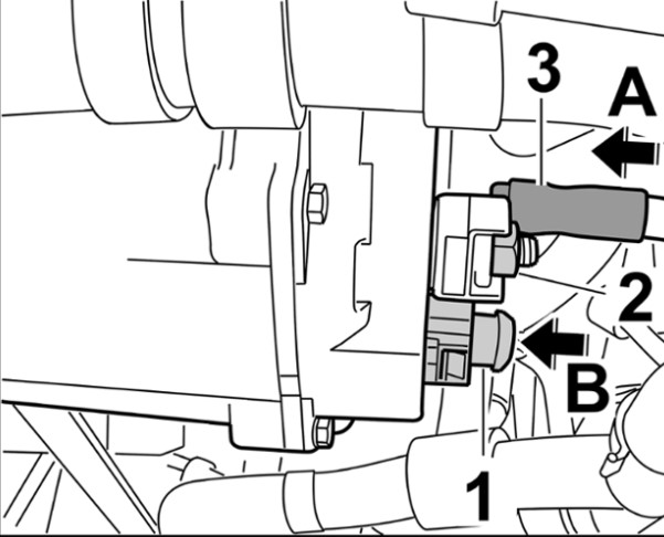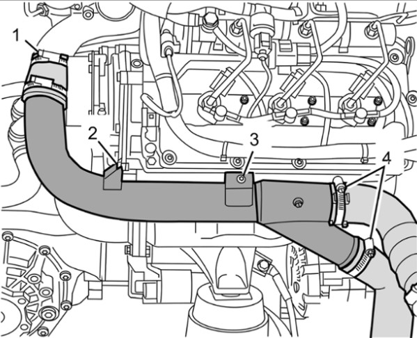 3 Закрепить шланги наддувочного воздуха -4- на патрубке воздуховода.