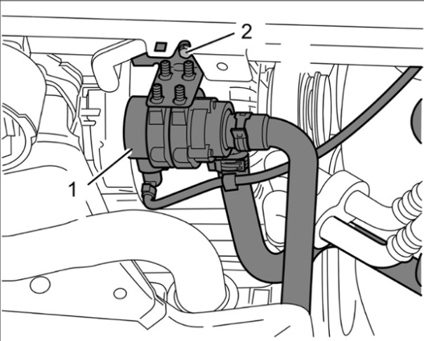 1 Расположить дополнительный насос ОЖ -2- и привернуть крепежным винтом -1-. Момент затяжки 22 Nm