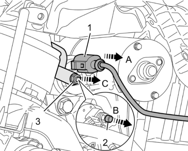 5 Отвернуть крепежную гайку -3- и снять провод B+ с болта с резьбой -стрелка C-.