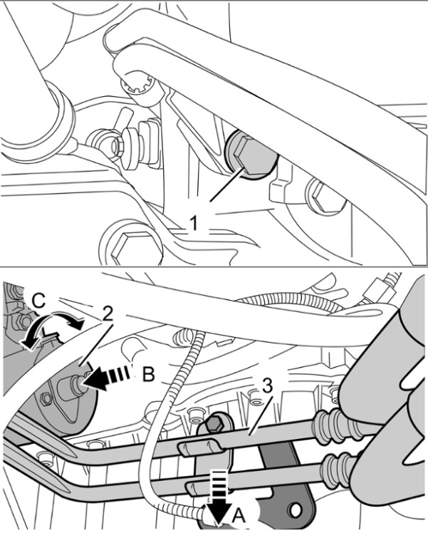 1 Осторожно оттяните трубопровод масла для АКПП -3- вниз -стрелка A- и вставьте стартер -2--стрелка B-. При необходимости поверните стартер -стрелка C-.