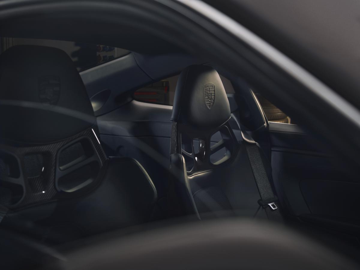 Салон 911 GT3 в исполнении с пакетом Touring пропитан атмосферой классического спорткара. Обод рулевого колеса, рычаг механической коробки передач/селектора, крышка отсека для мелких вещей на центральной консоли, подлокотники в дверях и внутренние ручки закрывания дверей обтянуты черной кожей. Все швы в салоне с частичной кожаной отделкой тоже выполнены в черном цвете. Центральные части сидений обтянуты черной тканью, в черном цвете выдержана также и обивка потолка. На подголовниках нанесены тисненые гербы Porsche. Накладки на пороги дверей и декоративные планки на передней панели и центральной консоли выполнены из матового черного алюминия.