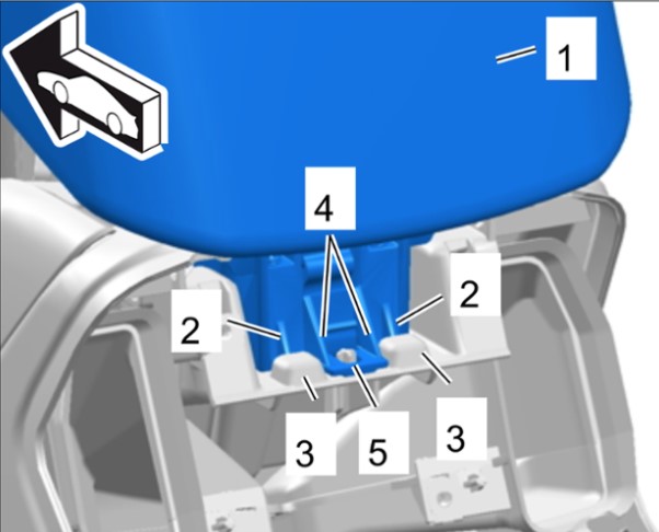 При монтаже крышки -1- следить за тем, чтобы внешние направляющие -2- задней крышки подходили в вырезы -3- на центральной консоли и внутренние направляющие -4- охватывали заднюю направляющую цапфу -5-.