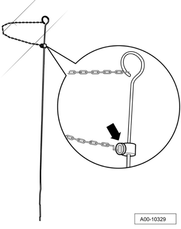 Задвинуть прибор для проверки индикатора уровня масла до упора (установочное кольцо) в трубку для маслоизмерительного щупа, затем снова вынуть его и считать уровень масла.