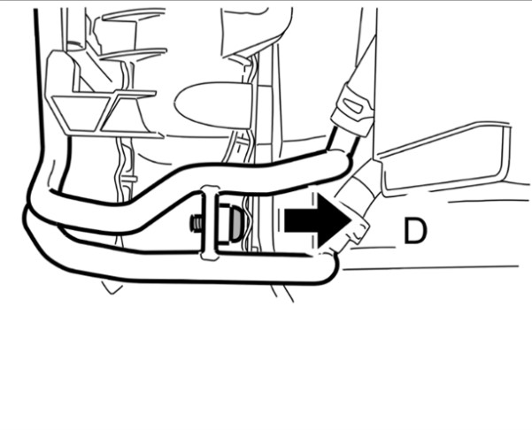 4 Выкрутить крепежный винт (слева по направлению движения) трубок радиатора ГУР -D- на радиаторе системы охлаждения.
