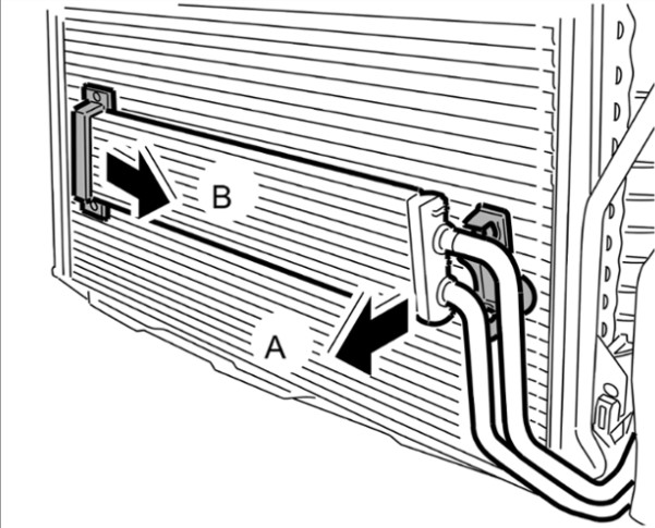 5 Извлечь из фиксаторов радиатор ГУР. Для этого вынуть трубки из фиксаторов, подав их вперед (-A- ), а затем извлечь из кронштейна (-B-), подав влево. Осторожно вывесить радиатор вниз.