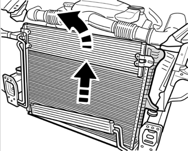 7 Приподнять радиатор и извлечь его, подав вправо и вверх. При этом обратить внимание на трубки кондиционера с левой стороны.