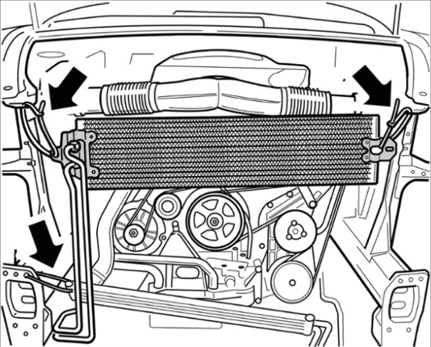двигатель, демонтаж, замковый, извлечь, монтаж, панель, помощь, радиатор, скоба, фиксатор, шланг