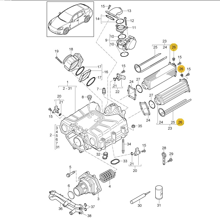 Принцип аналогичный, только тут два контура. Работу нужно сделать для низкотемпературного контура охлаждения и высокотемпературного контура охлаждения. Вакуумирование проводить через слив системы охлаждения каждого контура и залить через компоненты вакуумного устройства для заправки.