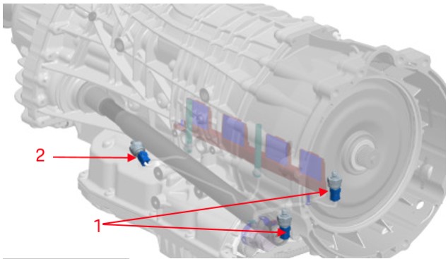 Датчики хода, частоты вращения и давления, а также датчик температуры соединяются жгутом проводов датчиков и выводятся из коробки передач посредством 16-контактного разъема КПП. Датчики хода и частоты вращения, а также датчик температуры трансмиссионного масла неразъемно соединены со жгутом проводов датчиков. В случае неисправности они могут быть заменены только как единый узел вместе со жгутом проводов датчиков. Однако датчики давления могут быть заменены по отдельности, поскольку они не имеют неразъемного соединения со жгутом проводов. Замену жгута проводов датчиков или датчиков давления можно произвести после демонтажа масляного поддона и гидравлического блока управления (HSG). После работ по замене необходимо произвести калибровку коробки передач.