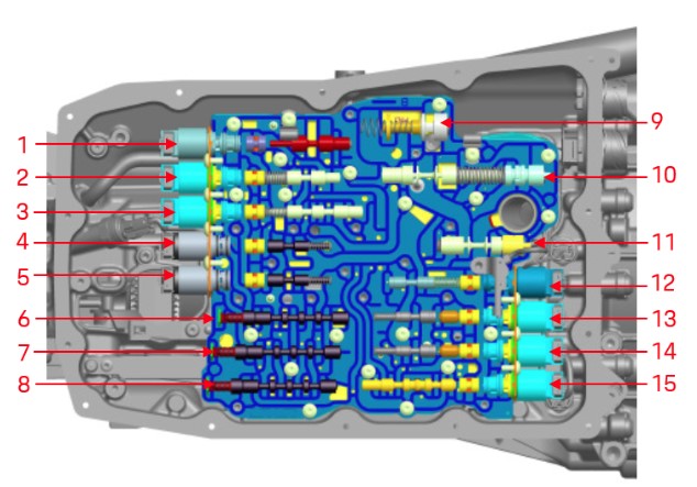 Датчики хода, частоты вращения и давления, а также датчик температуры соединяются жгутом проводов датчиков и выводятся из коробки передач посредством 16-контактного разъема КПП. Датчики хода и частоты вращения, а также датчик температуры трансмиссионного масла неразъемно соединены со жгутом проводов датчиков. В случае неисправности они могут быть заменены только как единый узел вместе со жгутом проводов датчиков. Однако датчики давления могут быть заменены по отдельности, поскольку они не имеют неразъемного соединения со жгутом проводов. Замену жгута проводов датчиков или датчиков давления можно произвести после демонтажа масляного поддона и гидравлического блока управления (HSG). После работ по замене необходимо произвести калибровку коробки передач.