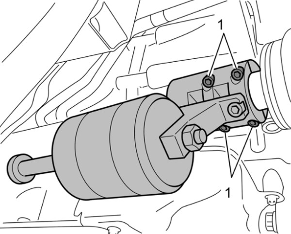 10 Опереть коробку передач с помощью подъемника для трансмиссии и зафиксировать коробку передач с помощью крепежной ленты.