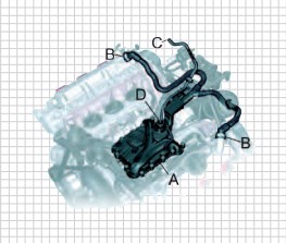 В качестве системы вентиляции картера используется вентиляция головки, при которой картерные газы отводятся к колпачкам клапанов. В колпачках клапанов для грубой очистки находится лабиринт. По гибким пластиковым трубкам газ направляется в пространство между рядами цилиндров блока двигателя, в котором находится маслоотделительный модуль. Каналы ОЖ встроены в маслоотделительный модуль. Таким образом, маслоотделительный модуль является крышкой блока двигателя. Газы очищаются в двух параллельно работающих циклонах. Чтобы в картере не нагнеталось слишком большое