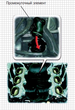Промежуточный элемент герметизирует подводящий трубопровод по отношению к модулю наддува. Открытие модуля наддува выполнено конически, чтобы облегчить ввод промежуточного элемента. Промежуточный элемент снабжен выступом. За счет него при монтаже обеспечивается точное позиционирование на выходе системы вентиляции картера.
