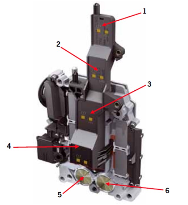 Датчики давления в гидросистеме 1 и 2 предназначены для контроля давления сцепления, а также для адаптации основного давления и давления в частях трансмиссии. Четыре датчика хода определяют положение каждом штоке вилки переключения передач/вилке.