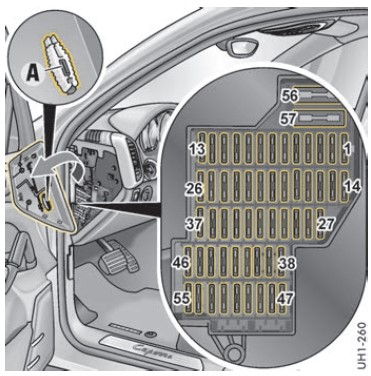 Если почитать схему, тогда будет понятно что предохранитель под номером 17 и номиналом на 5A. Блок предохранителей с левой стороны торца торпедо
