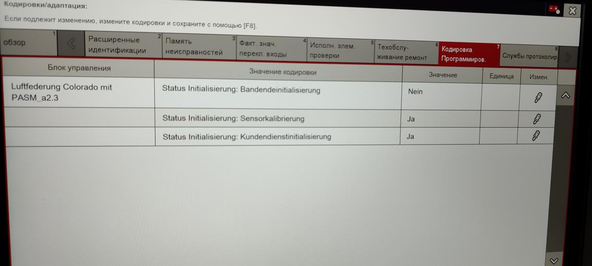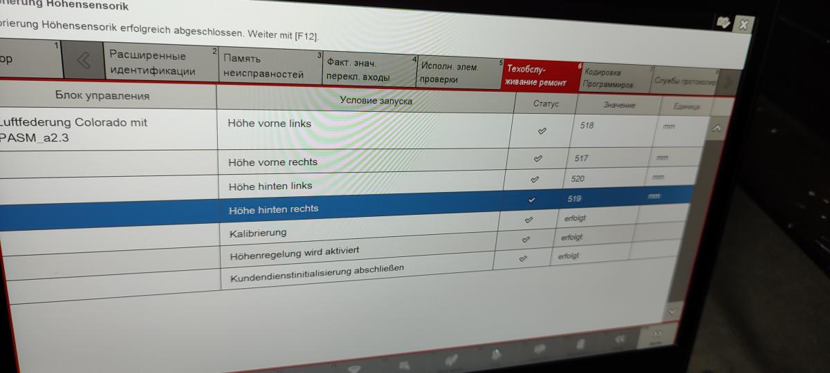 Поставил старые датчики,активировал в кодировках Bandendeinbetriebnahme,компоненты прошел,калибровку прошел,но машина стоит на максимум вверх(на полных балонах) при попытке опустить,пишет нет возможности.