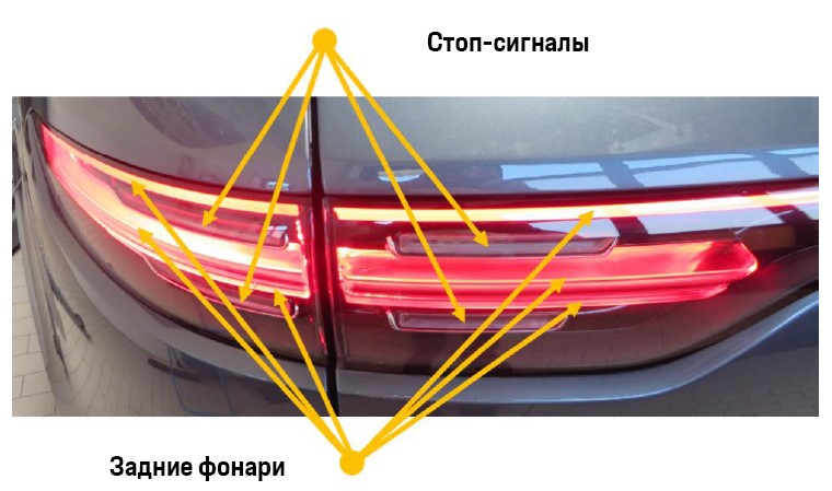 На расположенном ниже рисунке заметно, какой узел отвечает за стоп-сигналы, а какой за задний фонарь. Части этого фонаря изменяют свое назначение от заднего фонаря до указателя поворота и от стоп-сигнала до фонаря заднего хода.