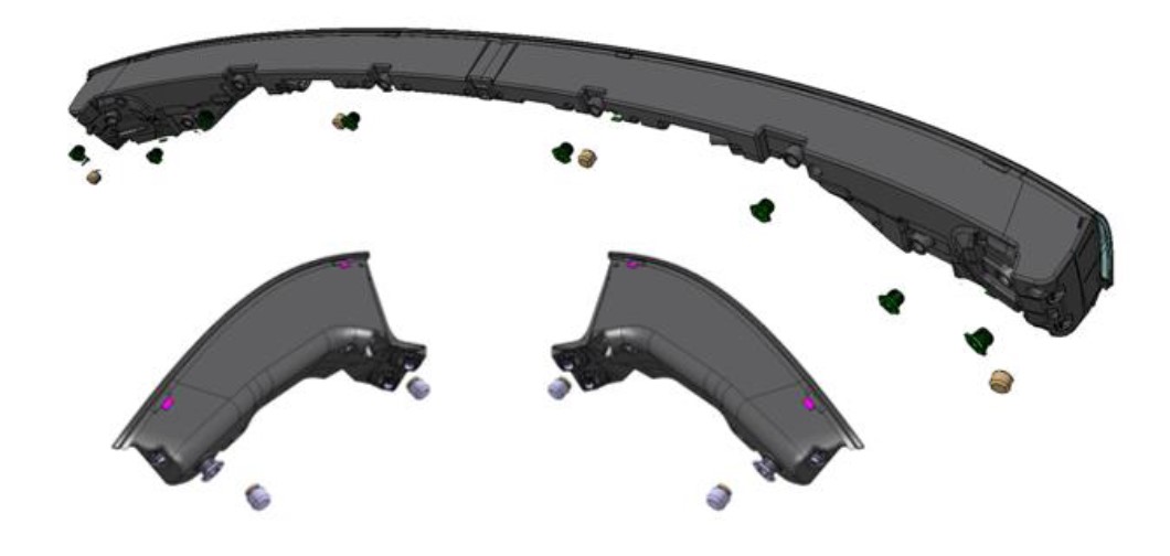 Левый и правый задние фонари и центральная часть регулируются в вертикальном и горизонтальном направлении. Крепление выполнено с помощью резьбовых втулок и 25 винтов с головкой Torx.