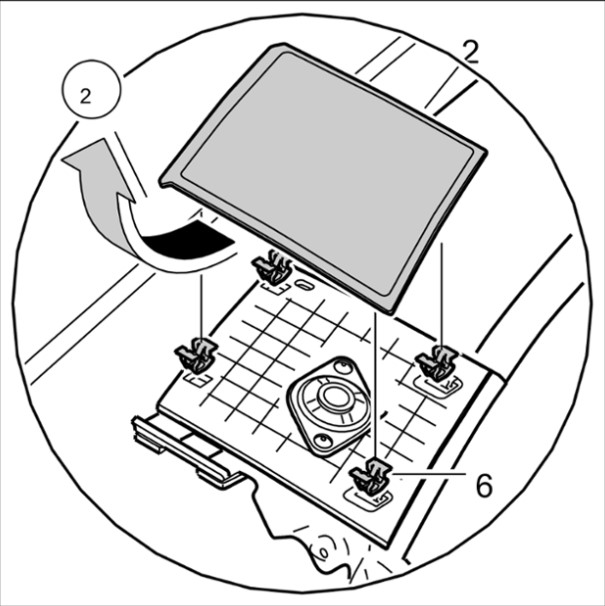 3 Пластмассовый клин слева и справа загнать под панель динамика -2- и, нажав, подать вверх.