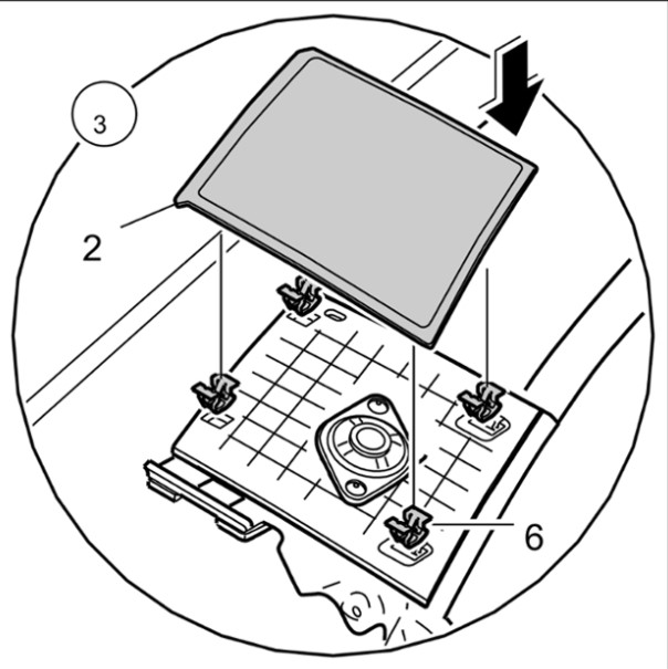 6 Установить накладку динамика -2- слева и справа в зажимы.