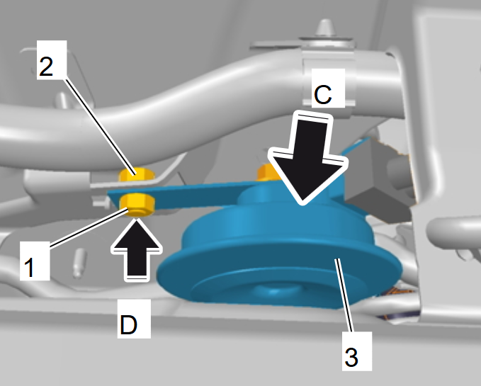 2. Расположить сирену охранной сигнализации -3- -стрелка C- и наживить крепежную гайку -1- .