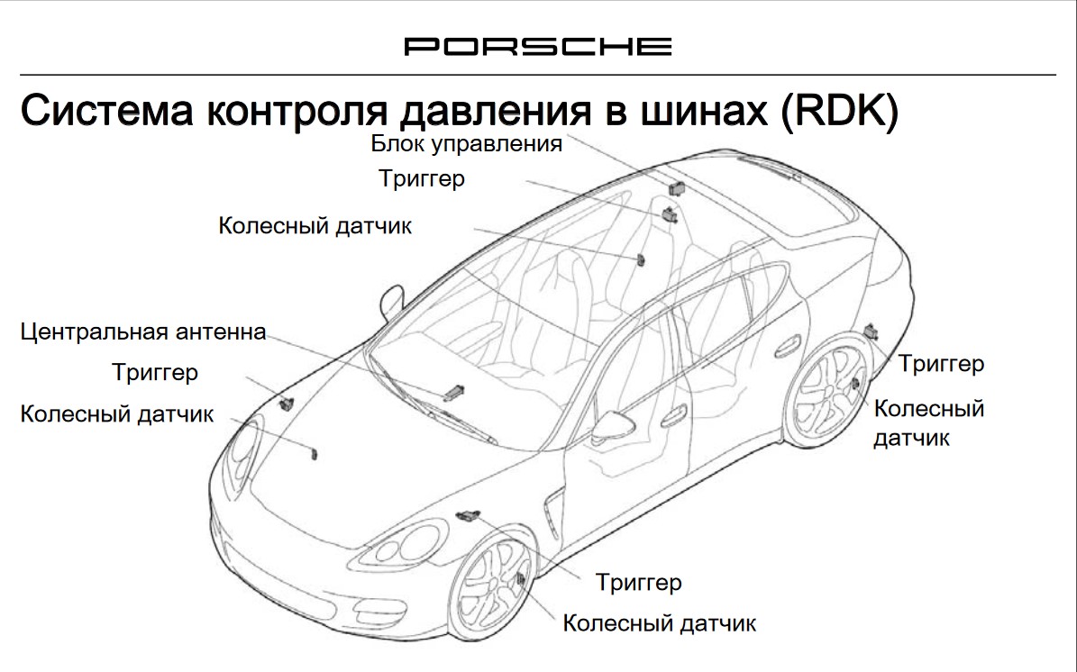 Четыре триггерных передатчика, каждый из которых установлен в соответствующей колесной арке под подкрылком, посылают к колесным датчикам направленный сигнал частотой 125 кГц, чтобы сразу же послать желаемую информацию на центральную антенну. Соответствующий запрос поступает с блока управления PSM при помощи сигнала с ШИМ.