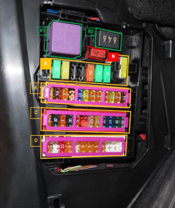 извлечь и при необходимости подать 12 В с плюсовым потенциалом. На автомобилях с правосторонним расположением рулевого колеса контакт аварийного питания находится на правом блоке реле/ предохранителей.