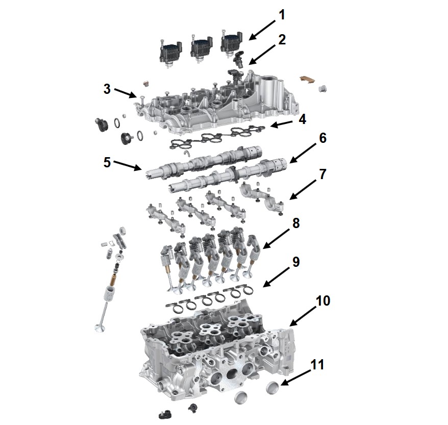 Разобранное изображение головки блока цилиндров с приводом клапанов