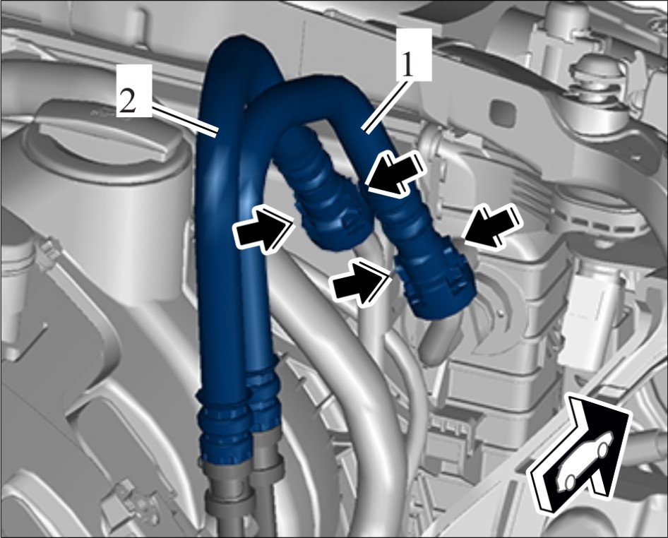 7 Вскрыть трубопроводы ATF -1 и 2- в месте разъединения -стрелки- и отжать их в сторону. Собрать вытекающие капли!