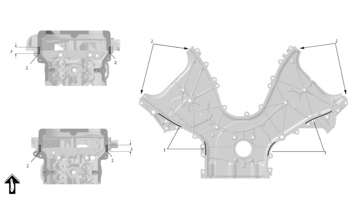 1 Заполните герметиком окошки листовых уплотнений -2-. Нанесите герметик на двигатель в отмеченных местах. .