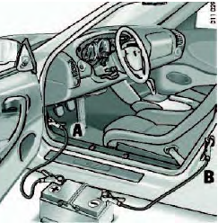 Для 911 Carrera, 911 Targa, 911 Turbo, 911 GT3, Cayman, Boxster: Плюсовой кабель сначала подсоедините к плюсовой клемме разряженного аккумулятора, а затем к плюсовой клемме питающего аккумулятора. Минусовой кабель подключить к клемме питающего аккумулятора, а затем к подходящей точке массы автомобиля с разряженным аккумулятором Эта точка массы должна быть максимально удалена от аккумулятора. Подходящей точкой массы может быть массивная металлическая деталь. Если на автомобиле нет подходящей точки массы, то минусовой кабель можно осторожно подключить непосредственно к минусовой клемме аккумулятора. На питающем автомобиле необходимо повысить частоту вращения двигателя. Попытка запуска не должна быть больше 15 секунд. После неудавшейся попытки запуска необходимо сделать паузу не менее 1 минуты.