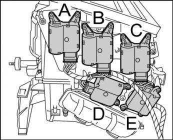 Исполнительный двигатель -B- системы кондиционирования – крайний левый – находится в корпусе системы кондиционирования, слева.