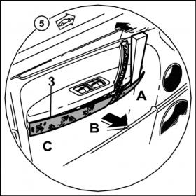 6. Накладку -3- поддеть в указанных позициях -A, B и C- пластмассовым клином