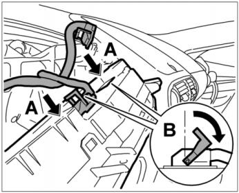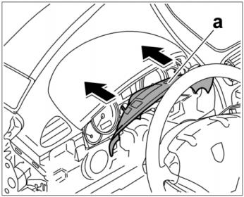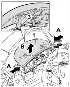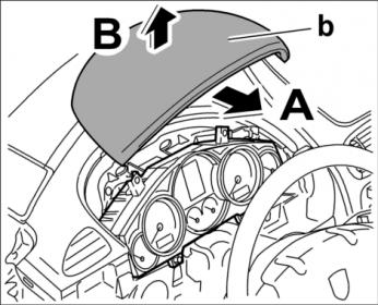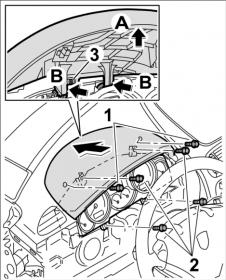 5. Потянуть блок панели приборов (накладку комбинации приборов) -b- сначала назад -стрелка A- , затем вынуть его вверх -стрелка B- .
