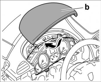 3. Выровнять комбинацию приборов (накладку комбинации приборов) -b- в монтажном положении -стрелка- .