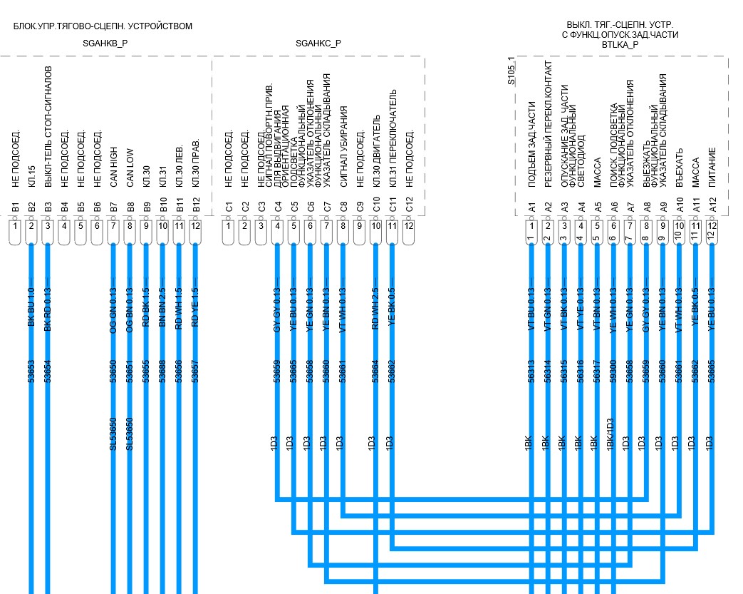 Меня смущает один момент, на последней схеме с 12 пиновой кнопкой 6 пин подписан 1BK/1D3. Если я правильно понимаю 1D3 это синий разъем на блоке управления прицепным. Куда его тогда подключить приходит провод из 6 пина в синий разъем?