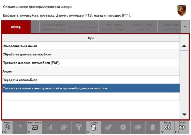 2 Выбрать функцию “Считать и при необходимости очистить память неисправностей всех блоков управления” и подтвердить с помощью клавиши F12 (Далее).