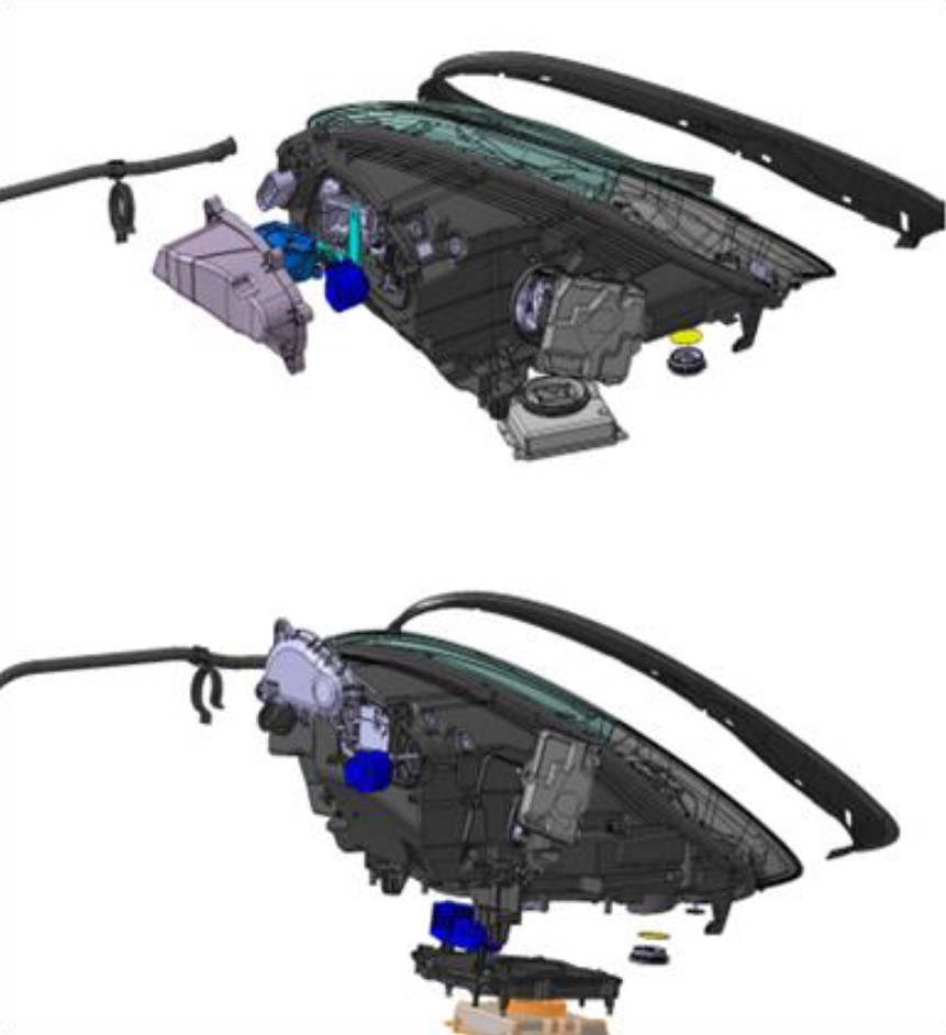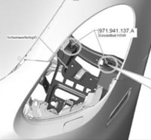 Все головные фары Panamera 2017 привинчены с помощью двух винтов непосредственно на каркас кузова. Крепежная пластина отсутствует. Для демонтажа фары необходимо снять подкрылок. Переднее пластмассовое прокладочное кольцо фары состоит из плексигласа (PMMA) и является составной частью основного корпуса.