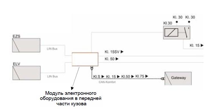 Электронное оборудование в передней части кузова выполняет функцию управления клеммами. Для этого к блоку управления подключены реле клемм 15, 30 и 50.