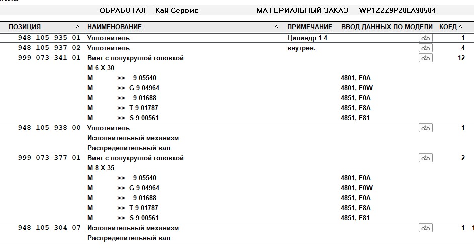 Владимир, добрый вечер. Автомобиль porsche Cayenne vin WP1ZZZ9PZ8LA90504. Подскажите, пожалуйста, номер электромагнитного клапана изменения фаз ГРМ на правой стороне и всех сопутствующих прокладок, меняющихся при его замене.