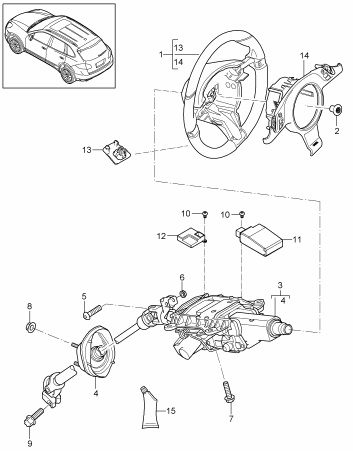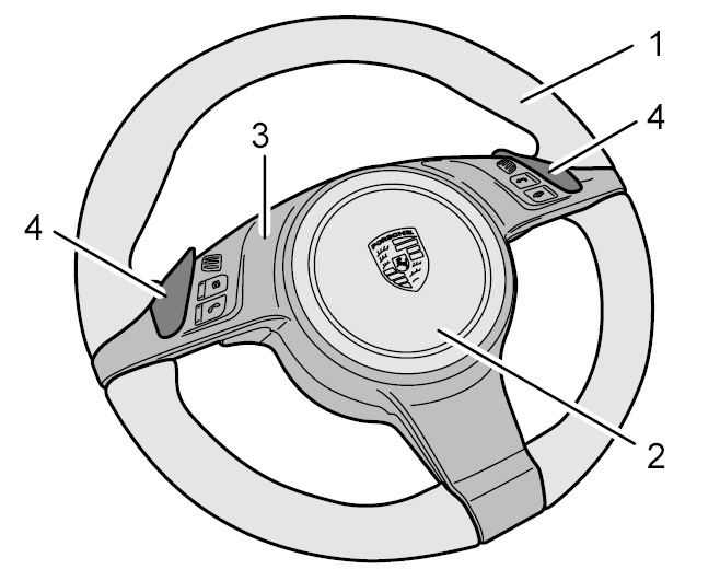 Качающиеся переключатели -4- для рулевого колеса PDK могут меняться только вместе с облицовкой рулевого колеса. Для обеспечения безупречной посадки, внутренняя сторона облицовки рулевого колеса смазана в двух точках и дополнительно приклеена к рулевому колесу в шести точках. При первоначальном монтаже необходимо использовать комплект двухкомпонентного клея (номер детали Porsche 000.043.207.48).