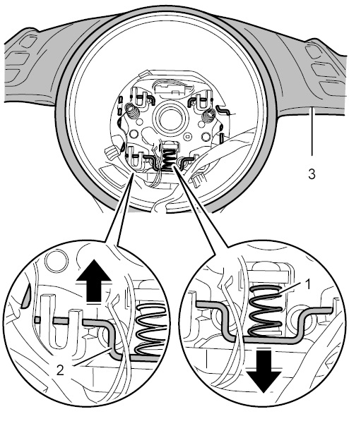 Вдавить, заблокировать стопорную скобу (фиксатор модуля подушки безопасности) -2- вниз -стрелка слева- . Зацепить нажимную пружину -1- .