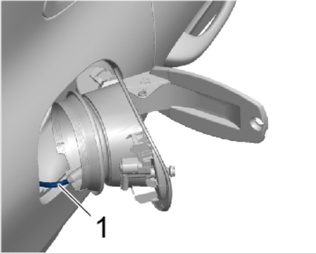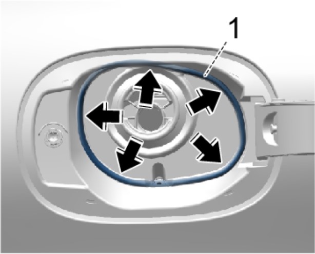 6 Выровняйте корпус люка топливного бака так, чтобы резиновая кромка -1- охватывала корпус люка топливного бака снаружи -стрелки- .