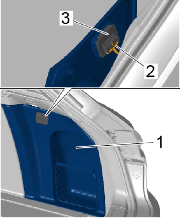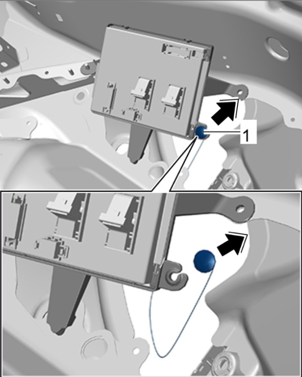 4 Продеть тросовую тягу аварийной разблокировки -1- через кузов вовнутрь.