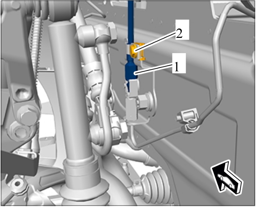 7 Подсоединить напорный трубопровод исполнительного механизма -1- к разделительной муфте в колесной арке.