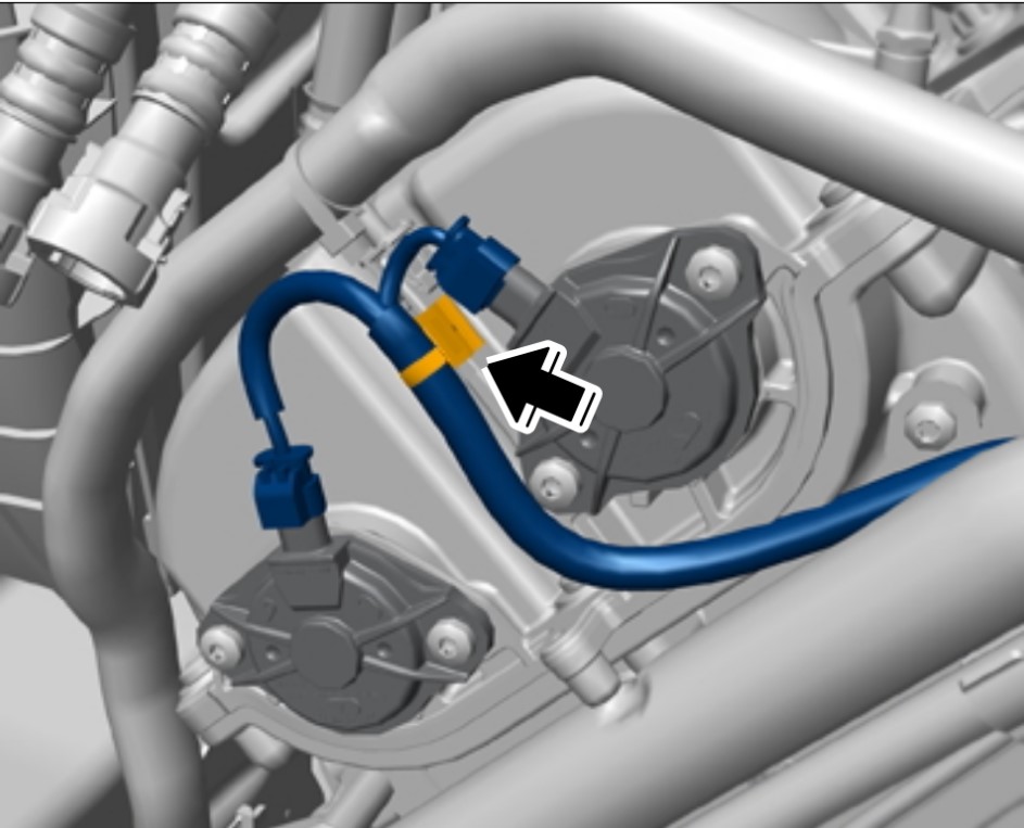 14 Отсоединить крепежный зажим кабеля для датчика Холла со стороны выпуска от крышки головки блока цилиндров -стрелка-.