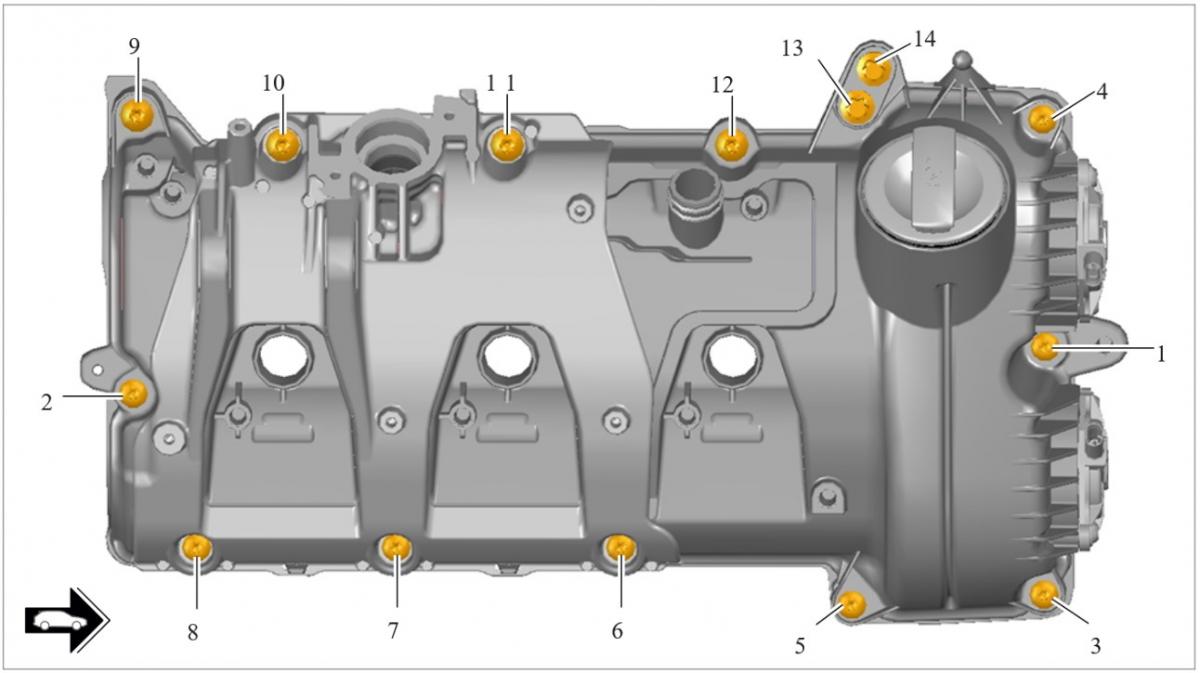 1 Ослабить крепежные винты крышки головки блока цилиндров -14 по 1-. (В зависимости от исполнения последовательность может отличаться от приведенного рисунка. См. технические параметры.)