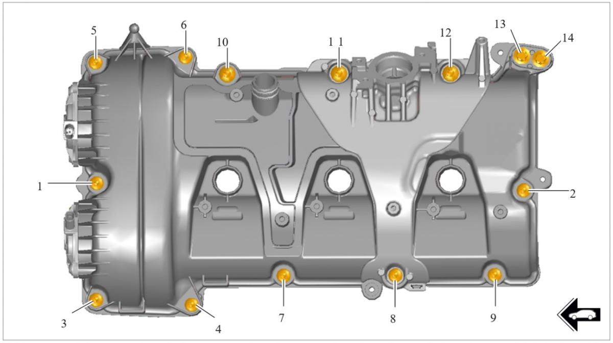 1.1 Ослабить крепежные винты крышки головки блока цилиндров -14 по 1-. (В зависимости от исполнения последовательность может отличаться от приведенного рисунка. См. технические параметры.)