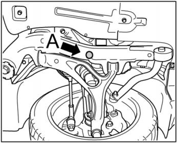 Измеряется расстояние (по центру колеса) между площадкой (пятно контакта шины на измерительной платформе) и точкой измерения -A- на балке подвески.