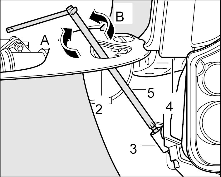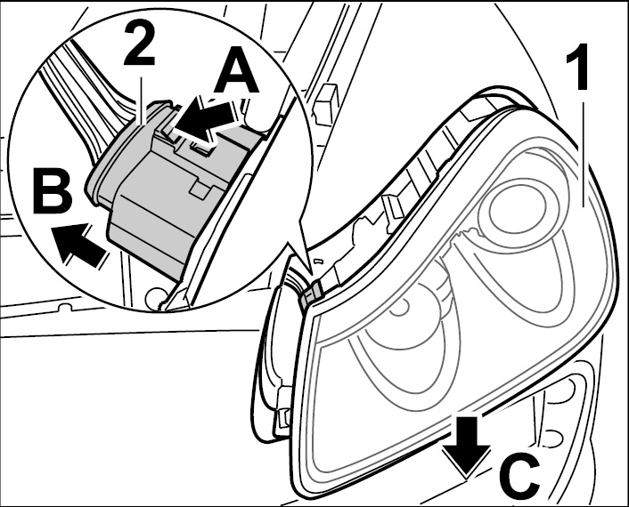 Разблокировать разъем -2- -стрелка A- и снять с основной фары -стрелка B- .